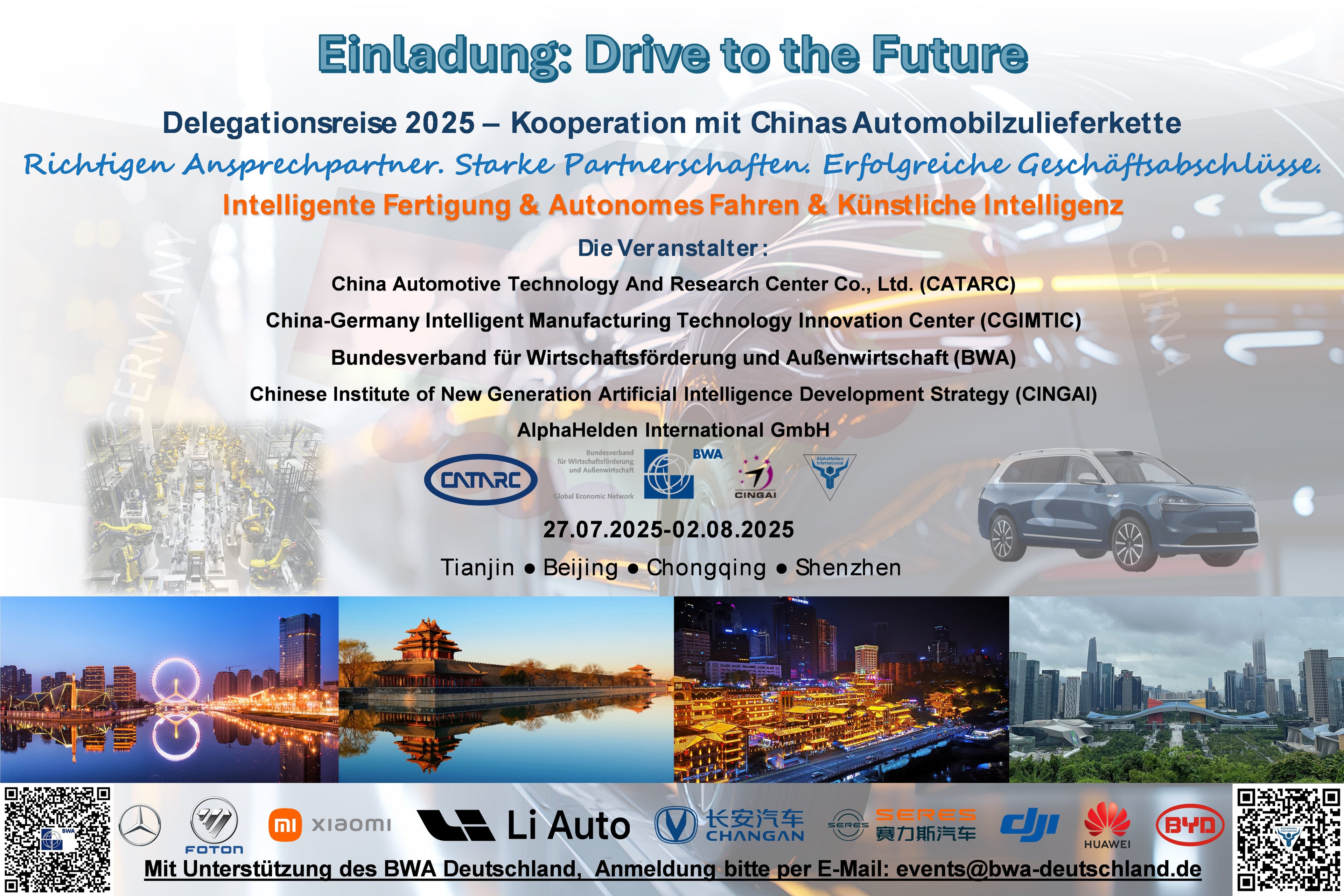 Sollte Ihr Unternehmen an einem Austausch mit der chinesischen Automobilzulieferkette interessiert sein, laden wir Sie herzlich ein, an unserer Delegationsreise nach China im Juli 2025 teilzunehmen.